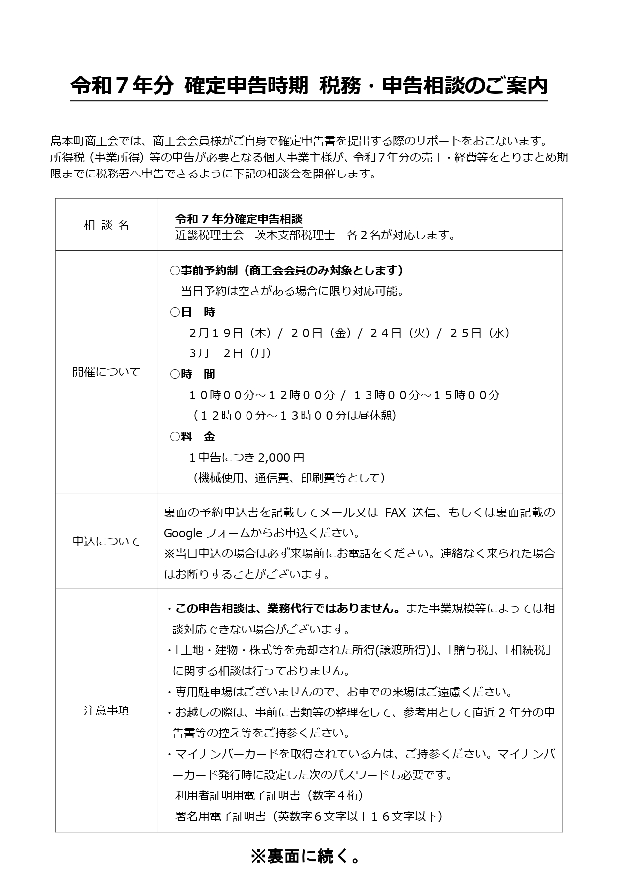 所得税(事業所得)等の申告が必要となる個人事業主様が、令和7年分の売上・経費等をとりまとめ期限までに税務署へ申告できるように下記の相談会を開催します。