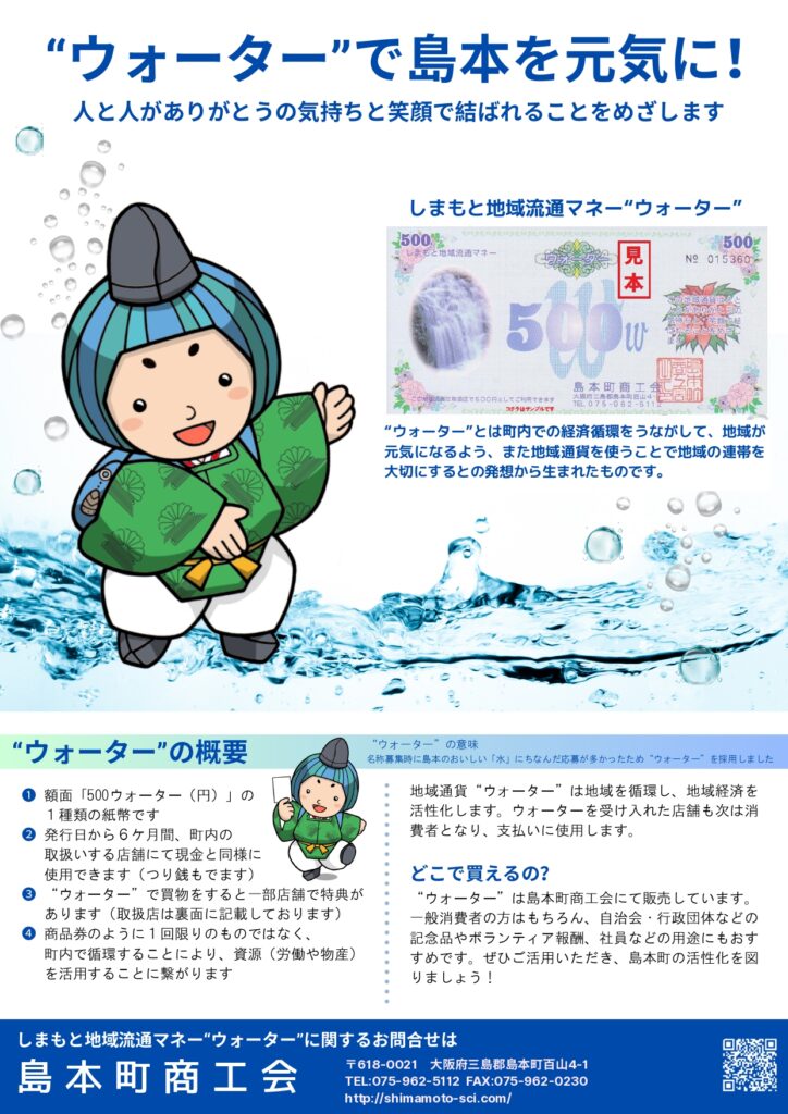 通貨の名称募集で島本のおいしい水を名称につけて欲しいという応募が多く英訳して『ウォーター』と名付けたものを採用しました。